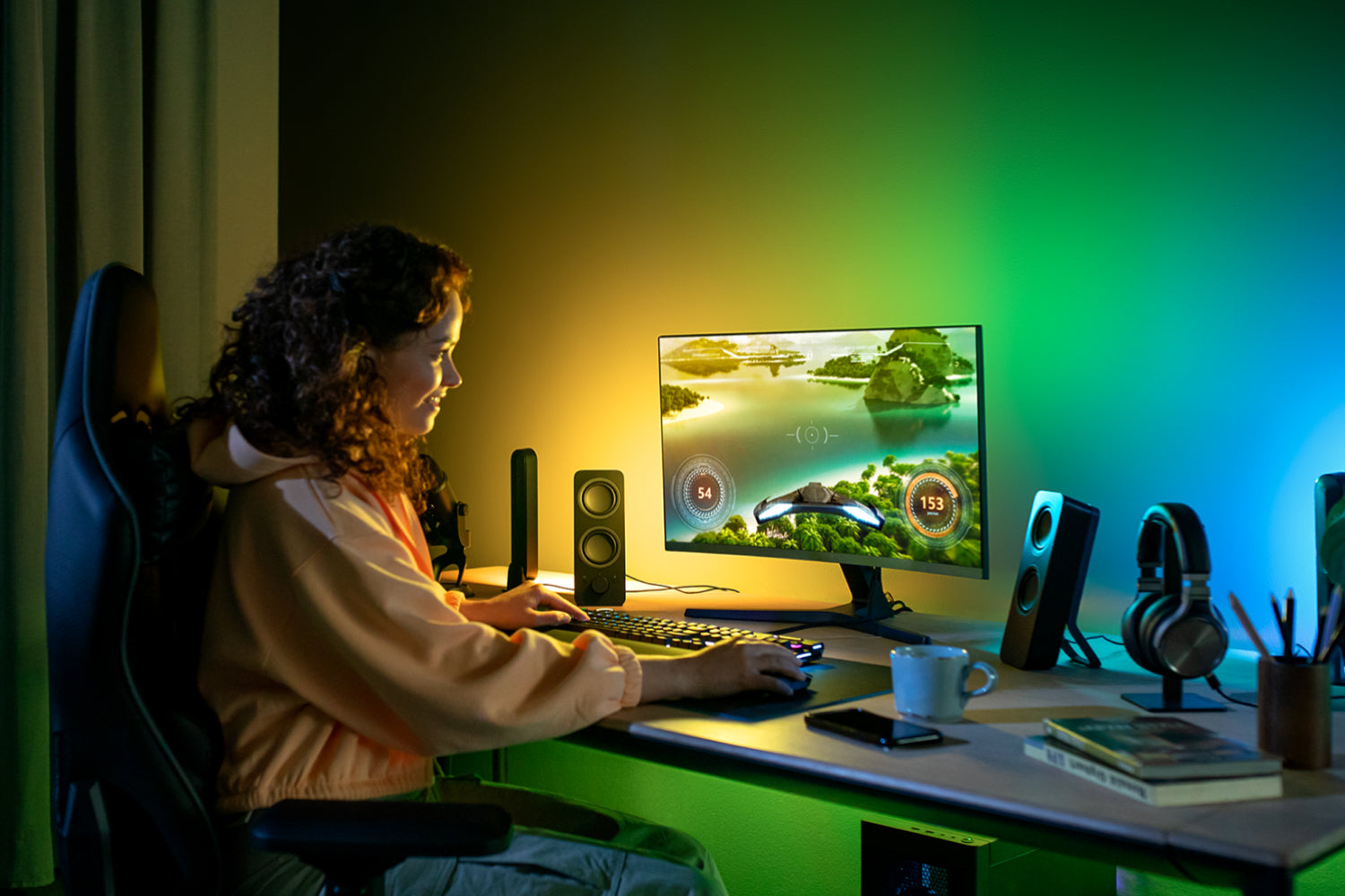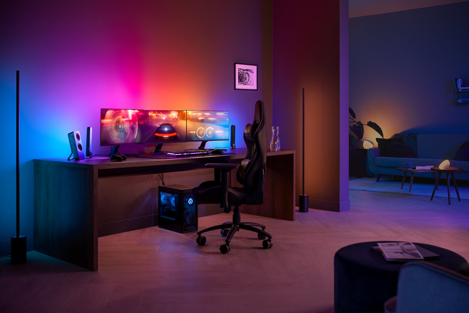Get a gradient of reactive, colorful light for your gaming setup! Attach the Play gradient lightstrip to the backs of your monitor setup with the included mounts. Start syncing with the Hue Sync desktop app to see the action on your screen reflected in the light.
